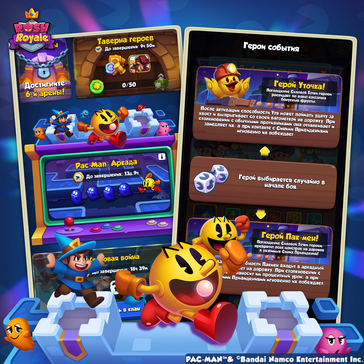 - В бой идут новые герои: отважная Уточка или легендарный PAC-MAN готовы дать отпор любой опасности. Выбор между ними случаен – кто бы вам ни попался, с ними ваши колоды заиграют совершенно по-новому!